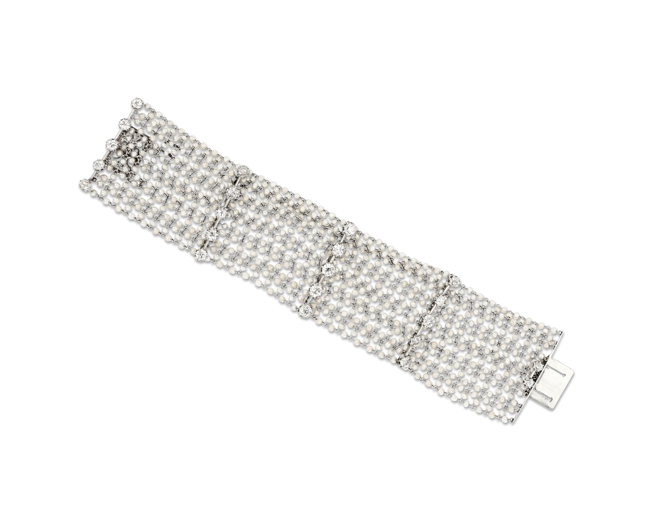 This elegant Art Deco bracelet epitomizes femininity and timeless style. Strands of white pearls are collected into a delicate openwork design that falls gracefully around the wrist; they are accentuated by 22 sparkling white diamonds totaling approximately 5.50 carats. Bold with a graceful silhouette, this bracelet displays all of the elegant modernity for which Art Deco jewelry is so loved. Set in platinum.