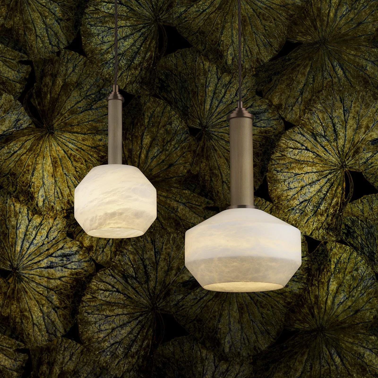 Exquisitely detailed pendants in the Caldera range provide another solution for spaces that require statement feature drops in a classic mid-century style. The unique white alabaster shade complements the Old English Brass reeded column and Rich Bronze stepped detail.