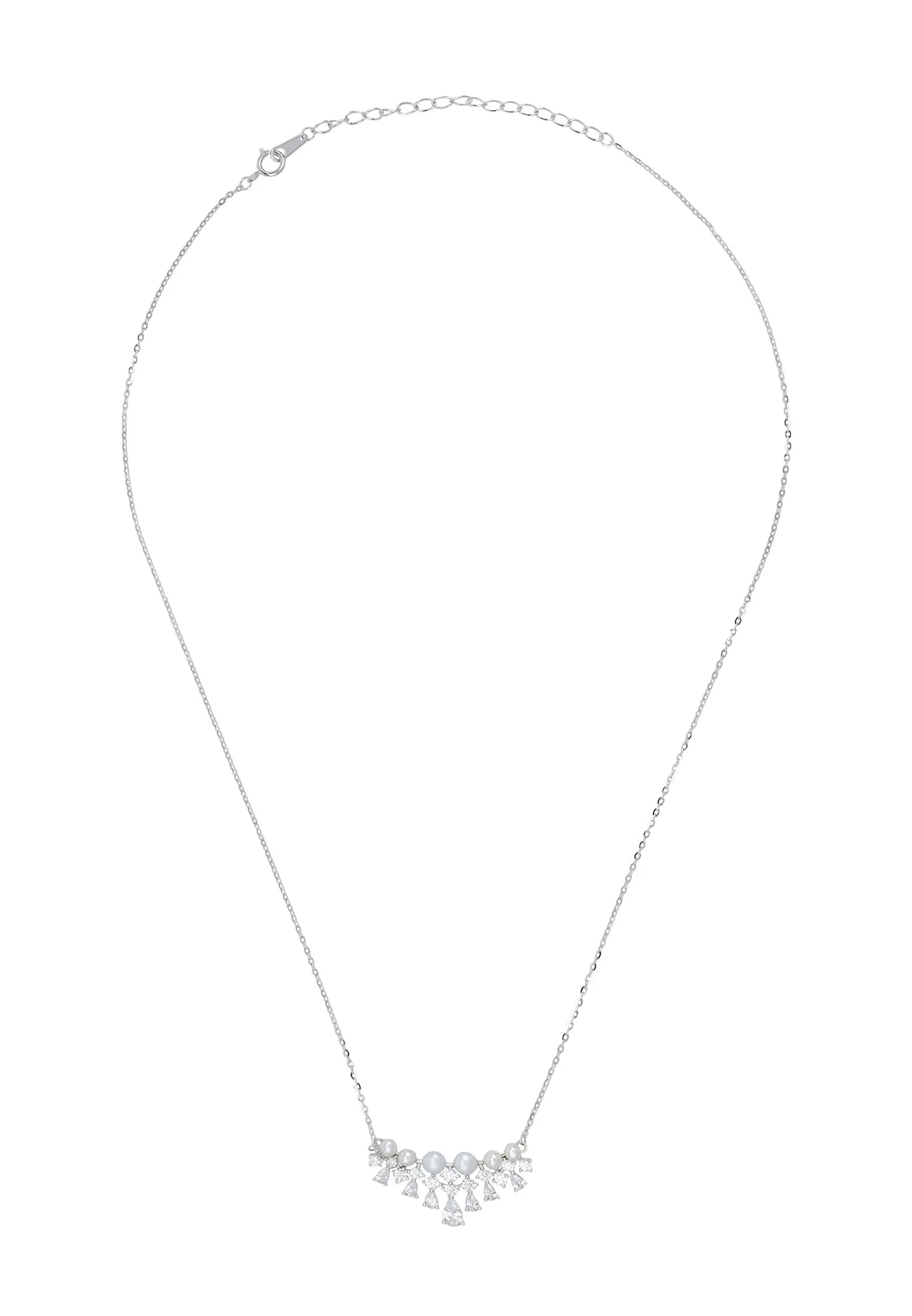 Exude vintage charm with this lace and pearls necklace in sterling silver. Designed with a delicately crafted lace collar motif, this elegant piece is adorned with a row of lustrous round pearls and shimmering white zircons, creating a graceful interplay of light and texture. The adjustable chain ensures a flattering fit, making it a versatile accessory for bridal elegance, special occasions, or sophisticated everyday wear. A timeless treasure for those who appreciate refined beauty.